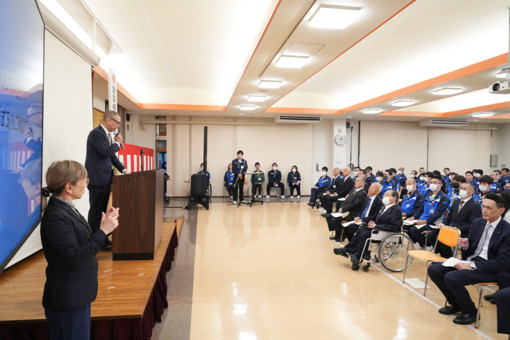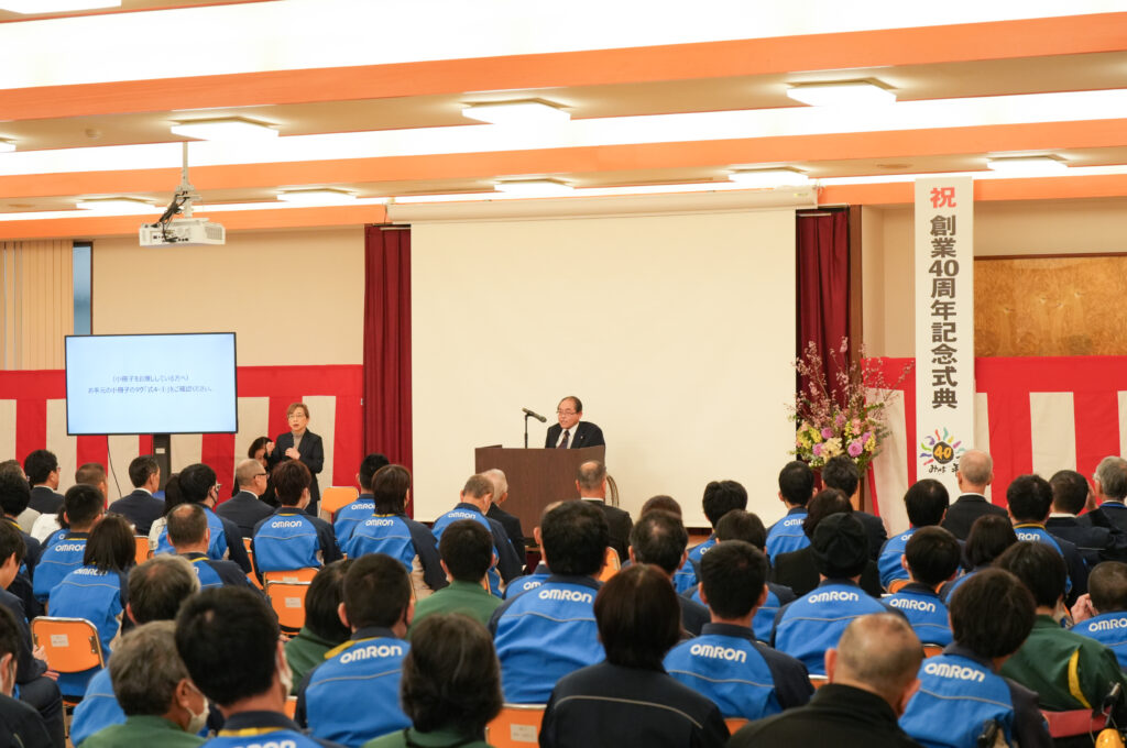 4月10日来賓者、利用者、従業員、職員合わせて約200人の方が参加して京都太陽の家とオムロン京都太陽株式会社の創立40周年記念式典が食堂で行われました。